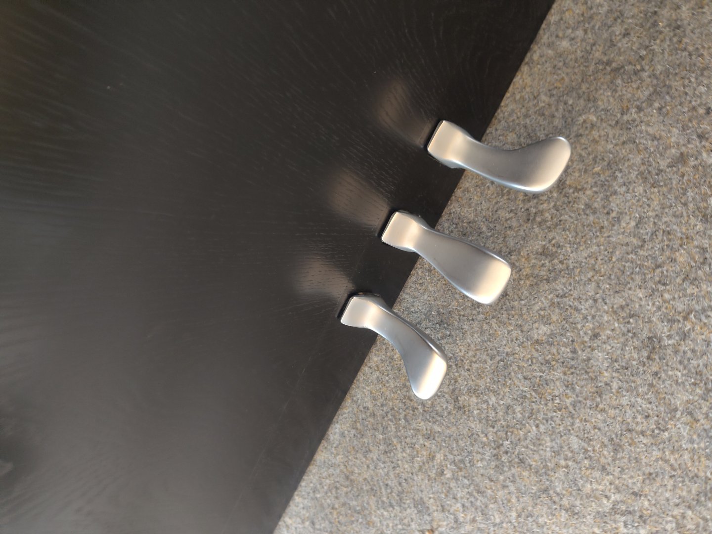 Dieses Klavier mit einem Echtholz - Eichenfurnier in schwarz satiniert ist mit matten Chrombeschlägen ausgestattet. Die Pedale, alle Scharniere und auch der Schriftzug sind in mattem Silber gehalten.