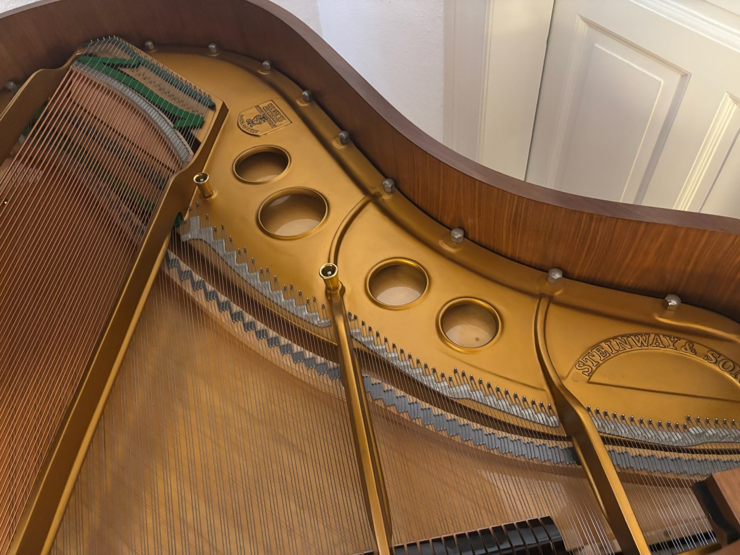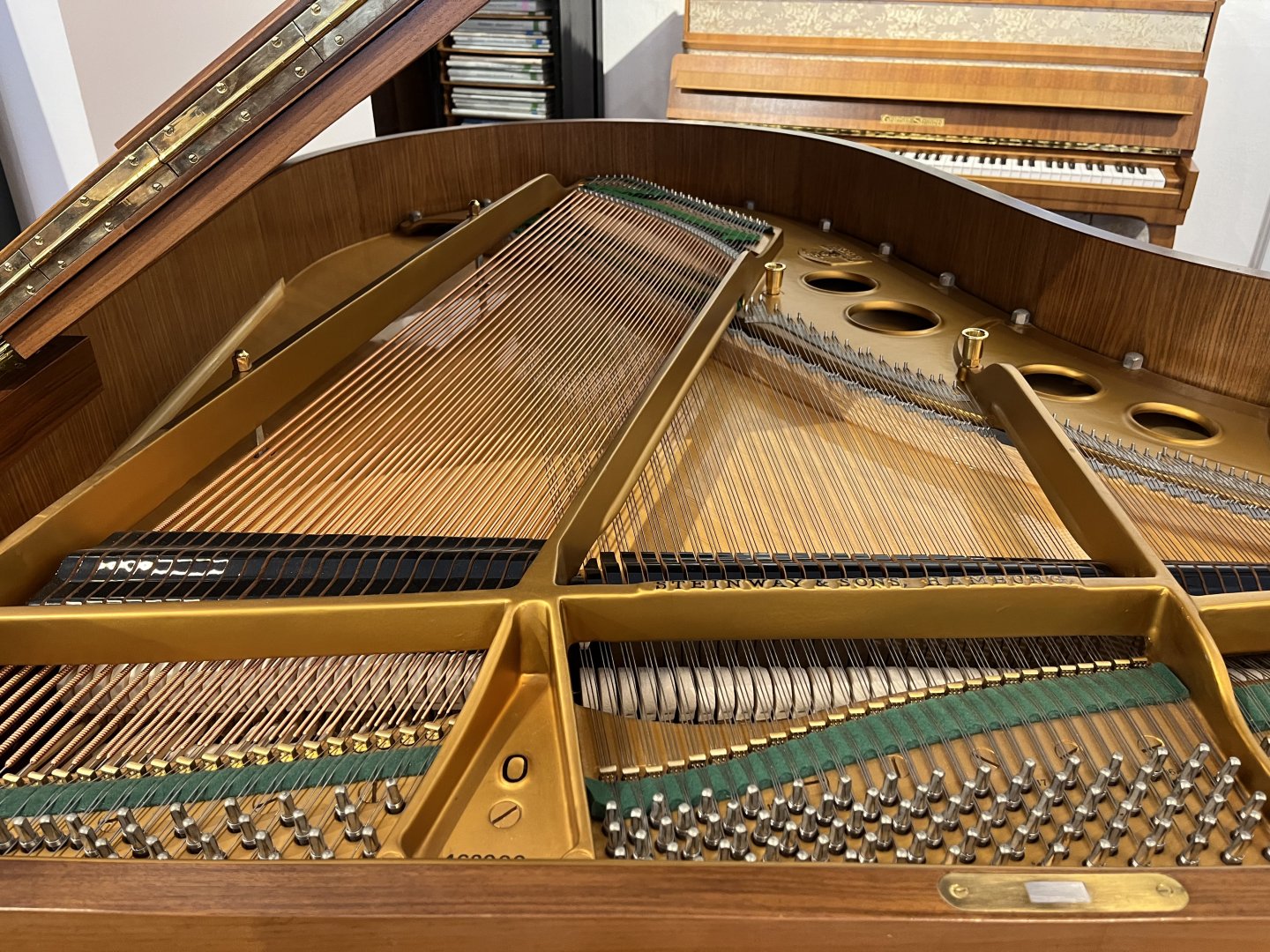 Dies ist das Steinway & Sons Modell O-180. Der größte der kleinen Steinways - in Originaler Französisch-Nußbaum Optik. Der Besitzer, der bereits ein Grotrian-Steinweg Klavier besaß, kaufte diesen Flügel im Jahre 1979 in unserem Haus. Seitdem wurde es stets sorgfältig von uns gewartet und gestimmt. Der Sohn des Besitzers verkaufte den Flügel kürzlich an uns zurück und aufgrund des ausgezeichneten Zustands, waren weder umfangreichen Arbeiten noch das Austauschen von Teilen erforderlich. In unserer Werkstatt wurde das Gehäuse überholt und der Flügel erhielt neue, hochwertige Kunststoff-Tastenbelege. Abschließend erfolgten eine sorgfältige Intonation und Regulierung, inklusive der Anpassung des Tastengewichts und Mehrfachstimmung.