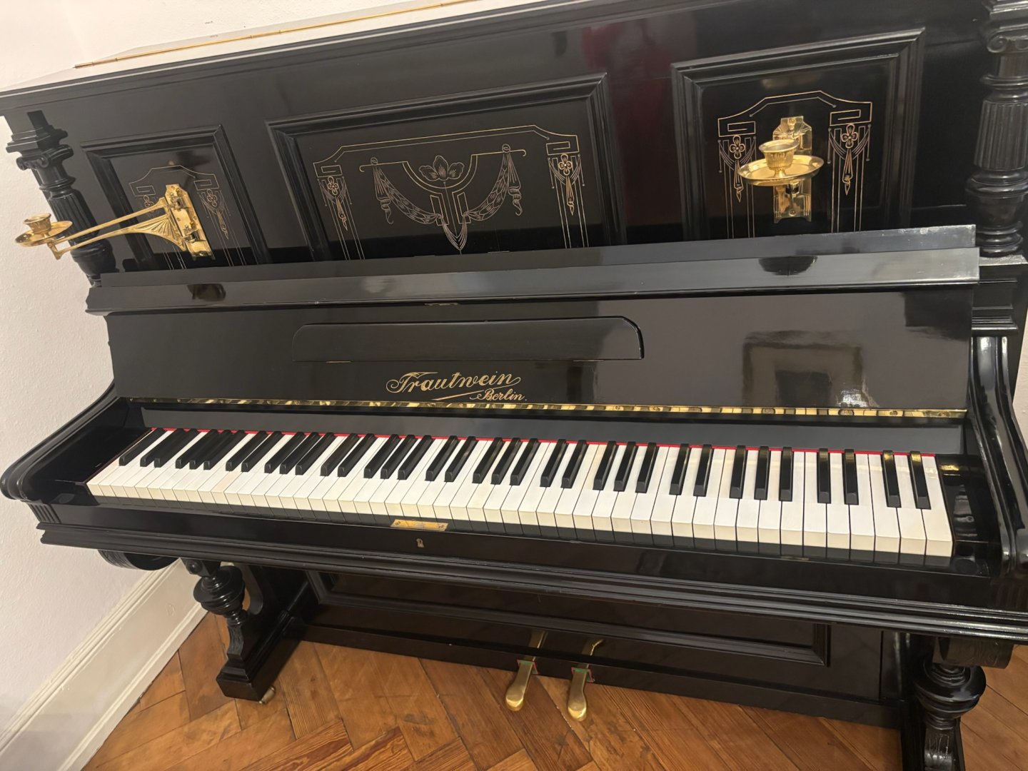 restauriertes Trautwein Klavier mit Kerzenleuchtern