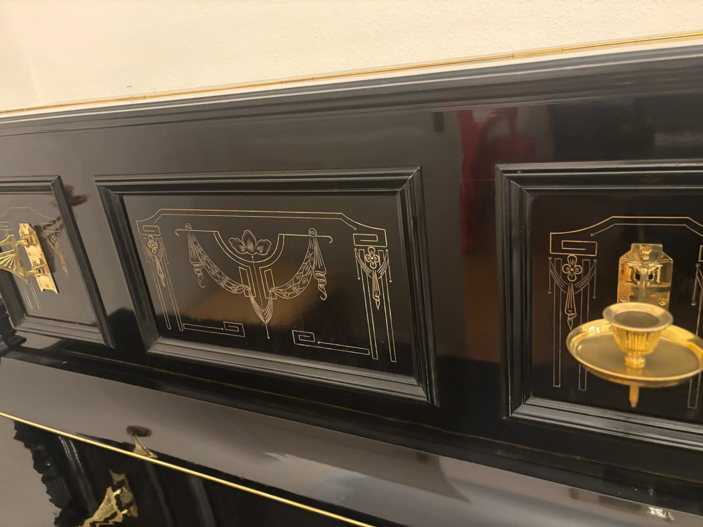 Ein wunderschönes Stück Musikgeschichte sucht ein neues Zuhause: Dieses Trautwein Klavier, Modell 125, stammt aus der Gründerzeit (ca. 1905) und wurde liebevoll von unserer Meisterwerkstatt restauriert. Der Korpus ist in edlem schwarzem Schellack mit goldenen Zierverzierungen gehalten – ein absoluter Blickfang für jedes stilvolle Interieur. Besonderheiten: - Originale Kerzenleuchter – vollständig erhalten - Aufwendige Schellackpolitur (hochglänzend) - Restaurierter Zustand, sofort spielbereit - Marke Trautwein, bekannt für handwerkliche Qualität und warmen, vollen Klang Dieses Klavier verbindet historischen Charme mit funktionaler Qualität – ideal für Liebhaber klassischer Instrumente, Sammler oder stilvolle Wohnräume.