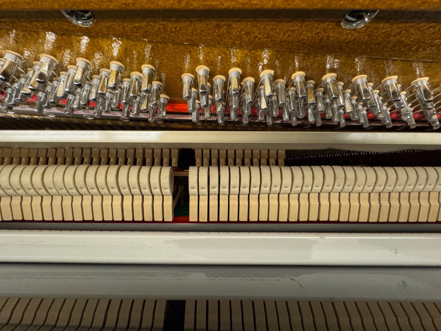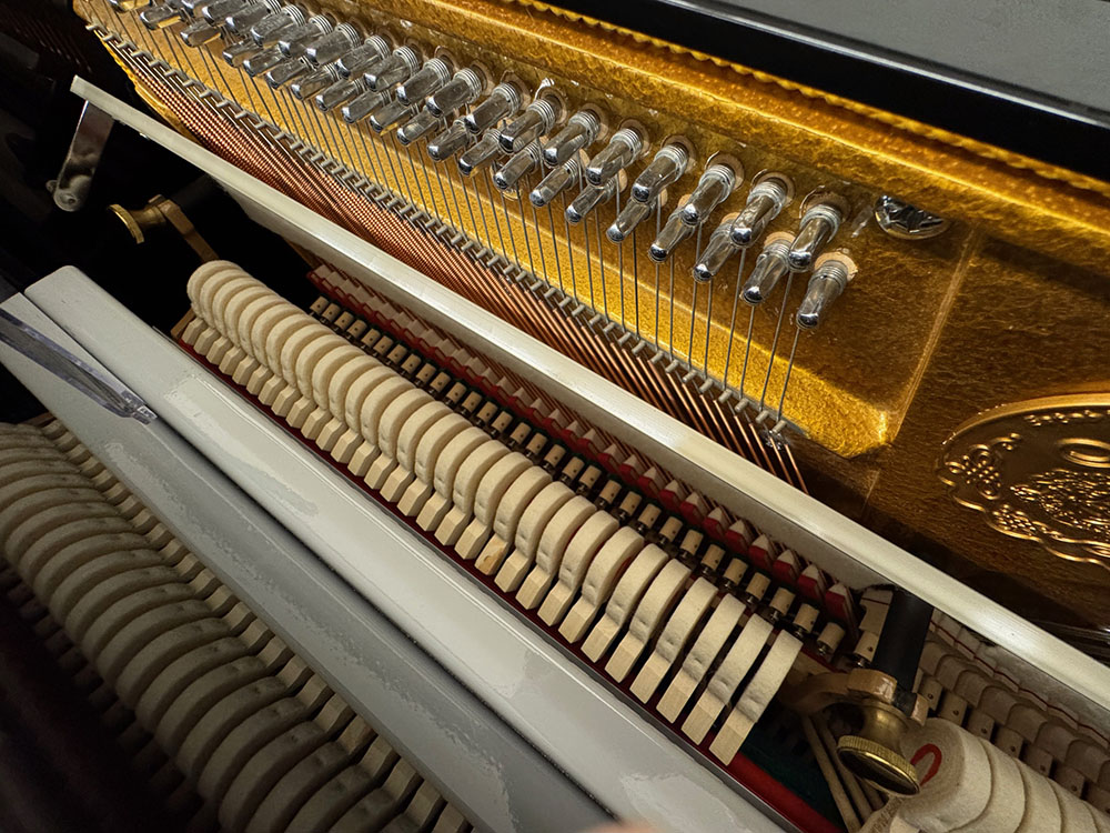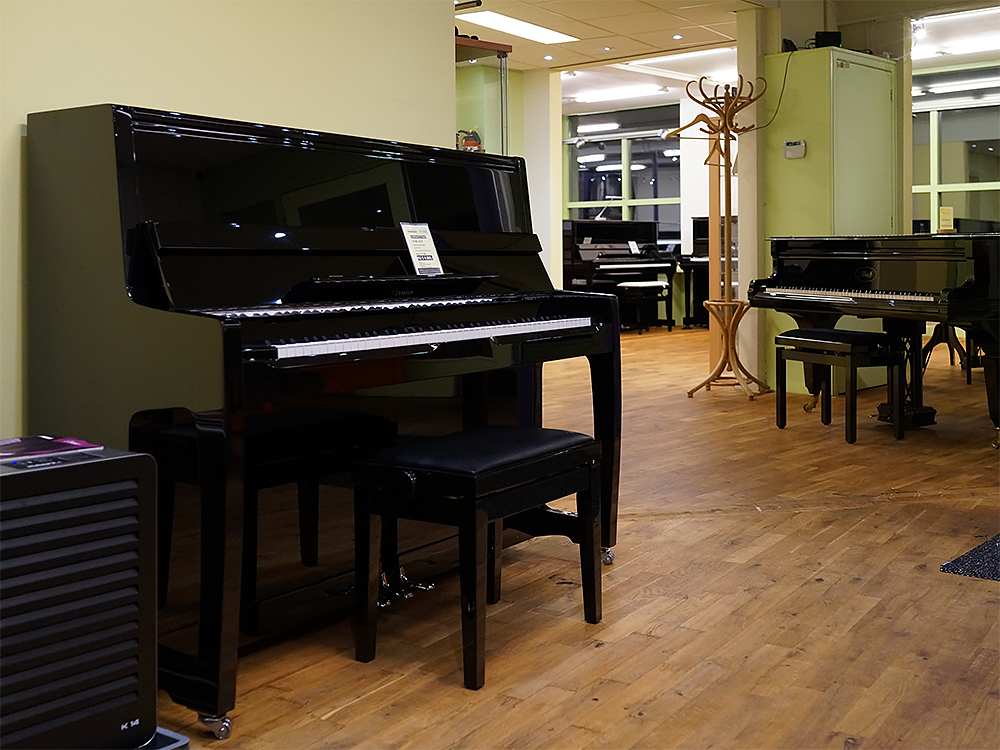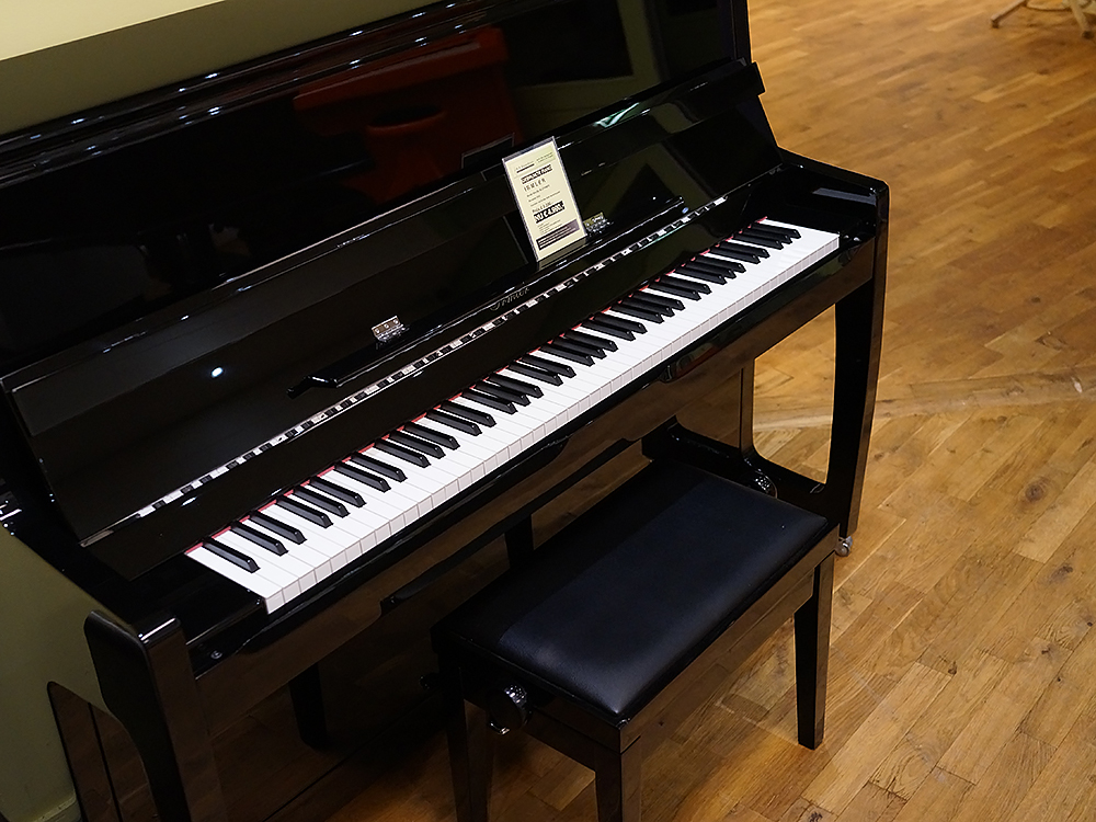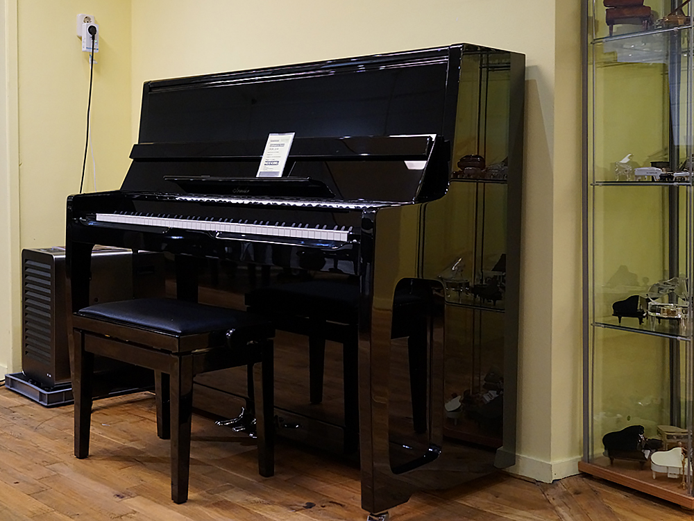 De piano is uitgevoerd in zwart hoogglans en voorzien Duitse Abel hamerkoppen met natuurvilt.