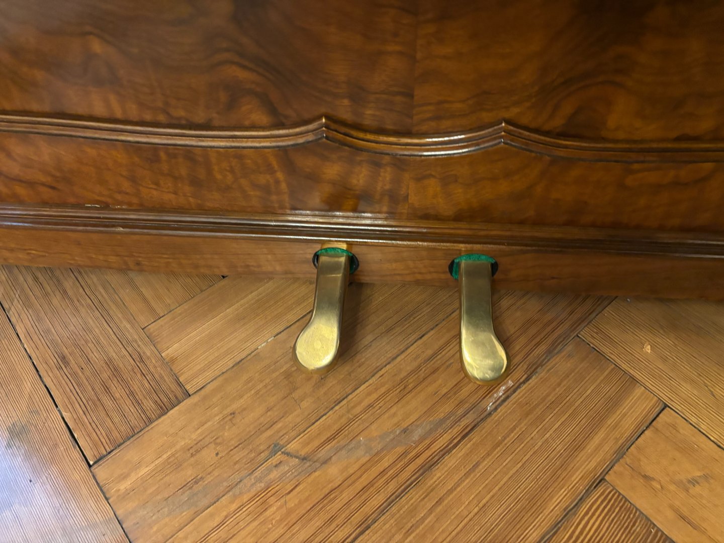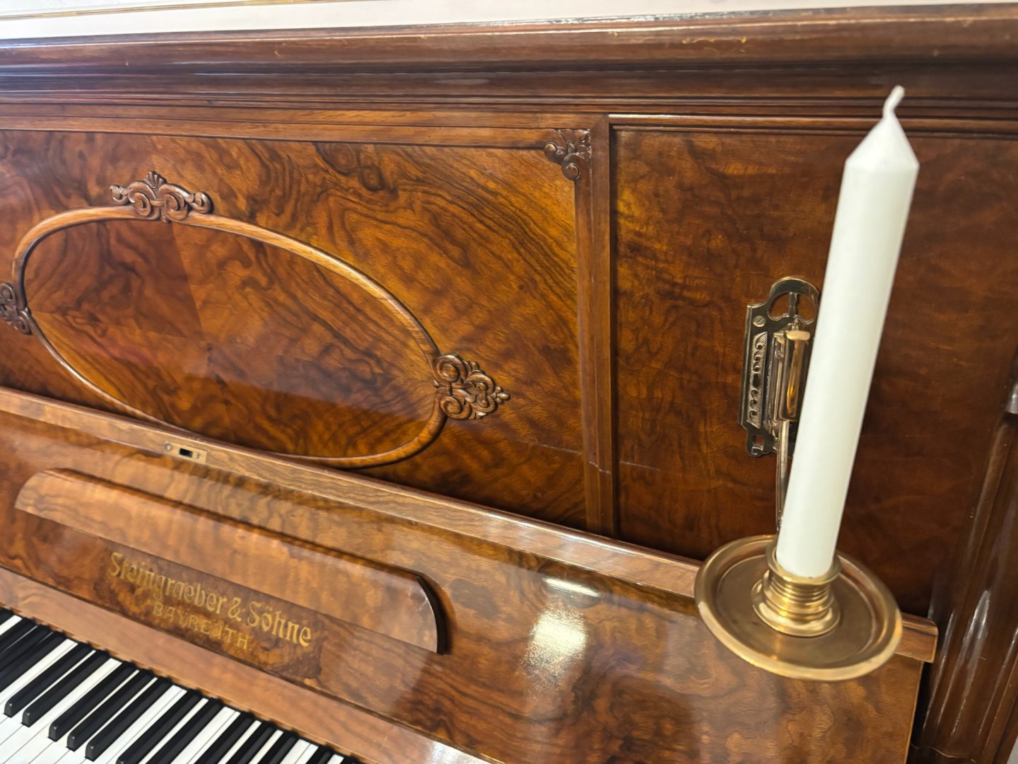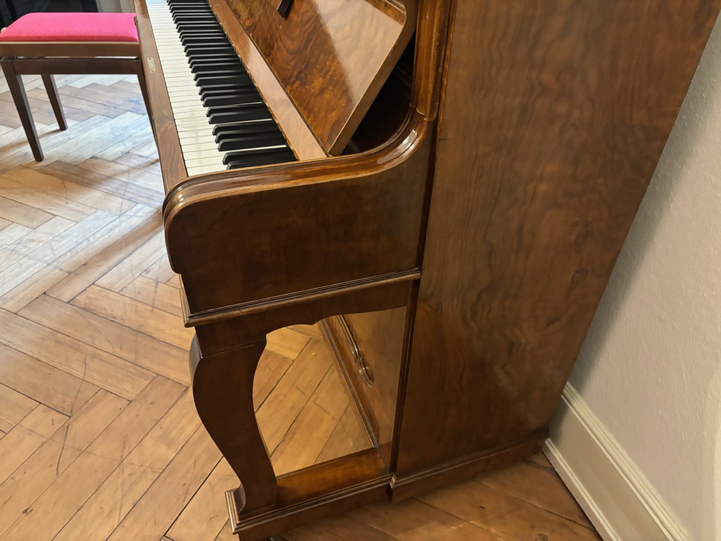 Dieses historische 134 cm große Steingraeber Klavier wurde 1910 in Bayreuth hergestellt. Das Klavier besticht mit einem deutlichen sonoren Bass und gleichzeitig klaren Tönen im Diskant, typisch für Steingraeber. Die Spielart hat Charakter und sucht einen Spieler, der sich genau darüber freut. Die Oberfläche in echtem Nußbaum mit Schellack ist gut erhalten und weist nur geringe Gebrauchsmerkmale auf. Mit den Verzierungen und den originalen Kerzenleuchtern ist das Instrument ein echter Hingucker. Und natürlich perfekt restauriert! Das Instrument wurde in unserer Meisterwerkstatt fachgerecht und mit einem besonderen Auge fürs Detail restauriert und ist somit in einem neuwertigen Zustand. Freuen Sie sich auf eine lange Spielfreude dank neuer Saiten, neuem Stimmstock, neuen Stimmwirbeln und neuen Hammerköpfen-